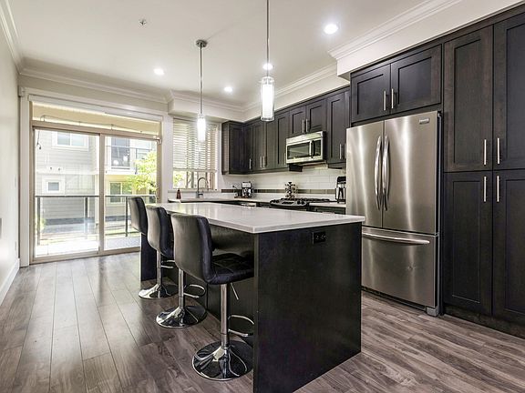 Fresh paintNew flooringQuartz countertopsPot lightsGas rangeBright open-concept kitchenPrivate patio