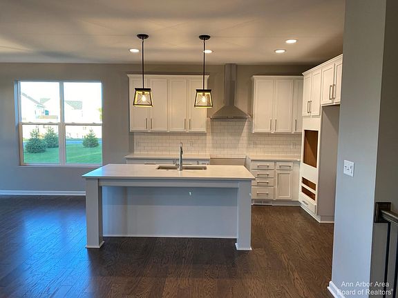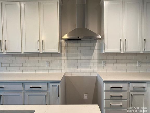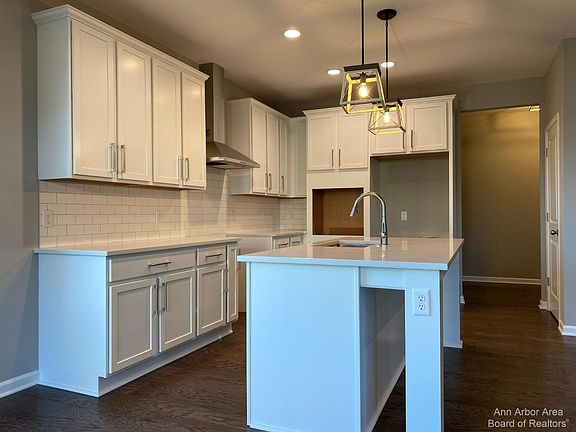 MOVE IN READY! BRAND NEW! Sleek, distinguished, newly designed Urban Farmhouse Style contemporary ranch. Located in beautiful Westchester Farms community in Chelsea. View Out basement & nature view. All first floor living space, this home highlights a spacious, open floor plan w/expanded Chef's kitchen featuring quartz countertops, 42'' White, painted maple cabinet w/hardware, stainless vented hood fan, tile backsplash, cabinet feature crown modeling & center island w/breakfast bar. Great room with gas fireplace & double windows. Primary suite with triple windows, walk in closet, private bathroom with dual sinks, luxury full tiled shower w/seat including mosaic tile floor & door. SS oven/micro combo, range and dishwasher included in kitchen. IMMEDIATE OCCUPANCY! w/daylight w/rough in for future bathroom & 9' ceilings. Attached 2 car garage. Accented with upgrades throughout including 5'' hardwood flooring, Sherwin Williams Light French Paint w/white trim & doors, Smart House features, beautiful graphite lighting package, recessed lighting. Sod/Sprinkler Prime location just minutes from downtown Chelsea, with low Sylvan Township Taxes. 1-year Builder's Warranty. Just completed photo are of this home!, Primary Bath