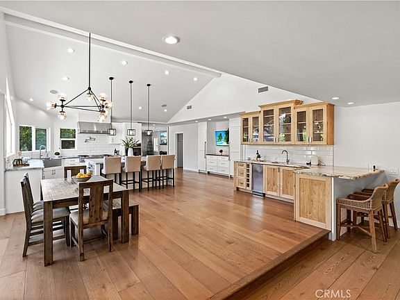 Inside, natural light pours through oversized windows, accentuating the vaulted ceilings, recessed lighting, and gleaming hardwood floors throughout. The heart of the home is the chef’s kitchen — a true showpiece featuring a grand center island, custom cabinetry, stainless-steel appliances, granite countertops, A-frame ceilings, and a walk-in pantry. The luxurious primary suite offers a spa-like marble bath with a soaking tub, separate glass-enclosed shower, dual vanities, and a large walk-in closet. Four additional bedrooms, a spacious family room, and formal living and dining areas provide exceptional comfort and versatility.