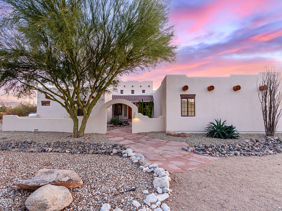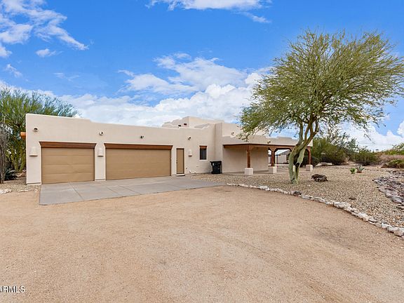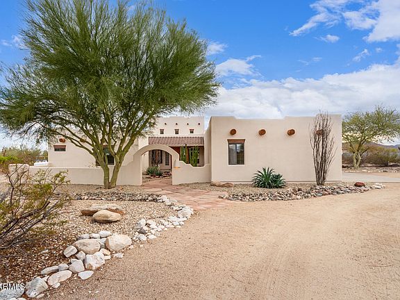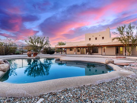 Discover this custom Santa Fe-style home on 2 private acres! It features 4 bedrooms, 3 bathrooms, stunning views of the White Tank Mountains and sunsets, and mature trees with desert landscaping. The Pebble-Tek pool with a waterfall is perfect for relaxing, and there's plenty of space to add a casita, barn, garage, or horse stalls. Inside, the great room offers a built-in gas fireplace, 20' ceilings, and wood beam accents. The kitchen has granite countertops, stainless-steel appliances, a breakfast bar, dual pantries, and a gas stove. The master bath includes double sinks, a garden tub, and a walk-in snail shower. Enjoy a large courtyard entry to the front of the home, full length covered patio, and a 3-car garage wired for 220V!