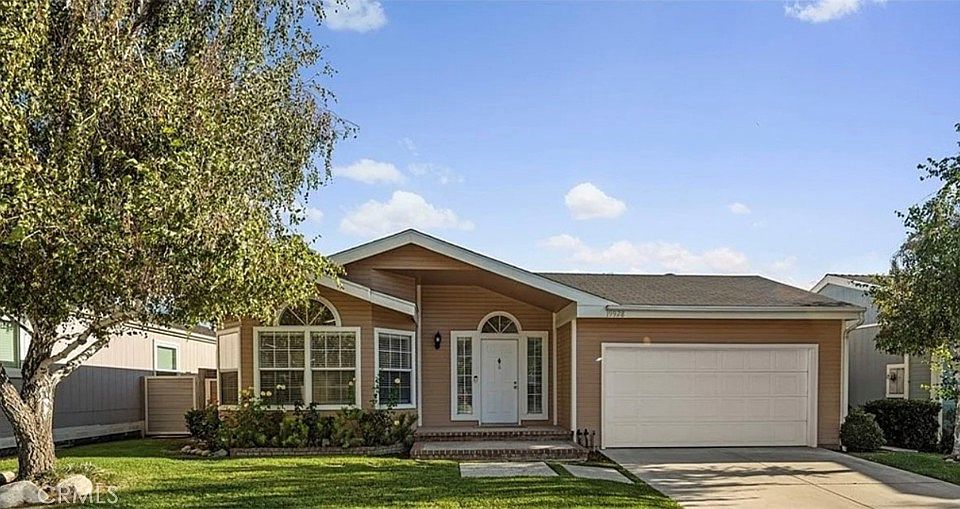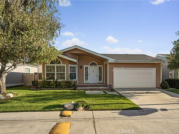 Welcome to this charming 3-bedroom, 2-bathroom home spanning 1,482 square feet, where comfort meets style! The recently painted interior and exterior, featuring natural tones, provide a bright and welcoming atmosphere. Inside, you'll find newer carpet in all bedrooms, easy-care vinyl in the bathrooms and laundry room, and elegant laminate flooring throughout the main living areas. The kitchen is a chef's delight with crisp white cabinets, sleek stainless-steel appliances, and a bay window dining area that offers a cozy spot to enjoy meals. The open-concept living room, complete with a fireplace, creates a perfect gathering space for friends and family. Each bedroom, along with the living and dining areas, is equipped with ceiling fans for year-round comfort. Step outside to the beautifully landscaped backyard featuring a charming patio slab with brick accents, a lush sod area, and well-maintained planters with flowers and wood chips—perfect for relaxing or entertaining outdoors. This home is the ideal combination of comfort and functionality—don't miss out! A two-car garage offers ample storage and parking space. This home is located in Canyon View Estates and has a current monthly land lease of $1,601.25 per month which includes community amenities such as a 24 hour gate, usage of 2 pools and spa, 2 sport courts, and 2 play areas. Canyon View also offers a community clubhouse and RV storage. Home is located near parks, bike & walking paths, shopping & entertainment, and schools. Easy freeway and Metro-link access. Home is a must see! Please submit pre-approval along with proof of funds with offer. Buyer to verify all before close of escrow. Welcome home!