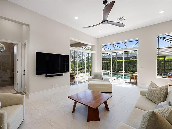 This fully renovated custom residence presents a rare combination of timeless design, modern technology, and a strategic layout where each space has been optimized for flow, function, and everyday ease of use. From the moment you enter, you are greeted by a light-filled open concept floor plan that is perfect for entertaining friends and loved ones. Italian porcelain tile, solid wood doors, LED lighting with Lutron Caséta smart switches, and a stunning selection of high-end finishes set the tone for a home that blends elegance with efficiency. At the heart of the home, the natural gas chef’s kitchen showcases a floor to ceiling design with a five-foot Galley workstation and dual Brizo SmartTouch faucets with instant hot and filtered water dispensers. Monogram appliances throughout include a 48-inch professional series gas cooktop with six burners, griddle and wall mounted pot filler, double French door convection ovens, a 48-inch paneled refrigerator, wine cooler, and drawer microwave. A Bosch SuperSilence dishwasher, Blum hardware, Silestone Calacatta Gold quartz, and a striking waterfall island elevate the space, while a beverage station with Kraus sink and Brizo Kitchen Bar faucet and a built-in pet feeding station with Brizo wall mounted pot filler make this the ultimate dream kitchen for your and your fur family. The spacious owner’s suite is a private retreat with dual custom closets, Caesarstone mitered edge countertops, Sietto cabinet hardware, a waterfall shower with niche, LED lit mirrors, storage pull outs with hidden outlets, and a soaking tub. The two guest ensuite bedrooms, including a flex room with Murphy beds, are finished with floating vanities, quartz and quartzite counters, custom lighting, and new cabinets and tile. The laundry and office have also been enhanced with quartz counters, under cabinet LED lighting, engineered hardwood flooring, and plantation shutters. Outdoor living includes an extended lanai with summer kitchen, natural gas TEC infrared grill, outdoor shower, and a saltwater pool with Hayward Aqualogic automation, and a spa-inspired pool bath. The three car garage features epoxy floors, Premier cabinetry, and overhead storage. Enjoy peace of mind with a discounted TRANSFERABLE FLOOD POLICY, brand-new tile roof installed in 2024, thirty-five solar panels with Enphase microinverters, a Navien tankless natural gas water heater, new IPEX plumbing and CAT 6 wiring, and a private irrigation well for landscaping. West Bay Club provides an amenity rich lifestyle for all residents including a newly built Gulf front Beach Club with restaurant and towel service, the renovated Bay House with resort style pool and state of the art fitness center, a River Park with boat launch, fishing pier and kayaks, six pickleball courts, eight Har-Tru tennis courts, bocce, two dog parks, and optional membership in a private Troon® managed championship 18 hole Pete Dye golf course.