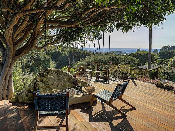Perched gracefully atop a lush, one-acre oasis this beautifully renovated ranch-style home in La Mirada Estates in Carpinteria, California, blends coastal charm with complete privacy and tranquility. Mountains rise up behind the property, while natural, terraced gardens cascade downward, opening to sweeping views of the sparkling Pacific Ocean and the Channel Islands.