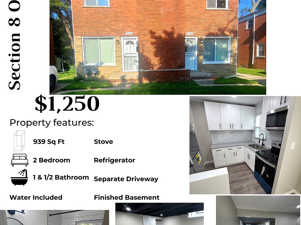 * Section 8 Only* 19943 Lahser Rd, Detroit, MI 48219 2 bedroom, 1 1/2 bathroom. 939Sqft. Completely remodeled Duplex available. Rent: $1250 (OR VOUCHER AMOUNT). Spacious unit on the Westside (off 8 Mile and Lahser). Beautiful home on a nice street. New kitchen, New bathroom, fresh paint, New carpet and Vinyl floors. Separate basement and driveway. Appliances included: refrigerator, stove, garbage disposal, and microwave. Tenant pays gas and electric. Owner pays water. No pets. Security deposit: $1350