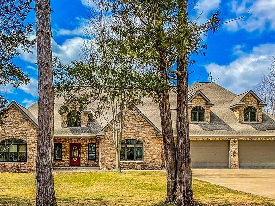 Featuring granite finishes, ceramic arches, and multiple patios. Single level with a bonus guest suite located above a 5-car garage with a private entrance. The 4-bedroom property offers sunset views and is located near a public boat launch, providing access to over 3,000 acres of boating on Cross Lake, with connections to Pokegama via the Snake River. Includes features such as cherry cabinetry, granite countertops, 8' doors, race track ceiling in the formal dining room, in-floor heat, knotty pine porch with wet bar, gas fireplace, whirlpool tub, built-ins, and a large heated 5-car garage. Bonus room above garage functions as a third bedroom.