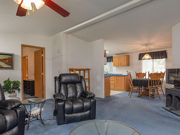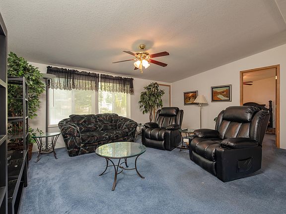 This well cared for home offers 3 bedrooms, 2 bathrooms and a large, fenced and landscaped yard that backs up to a common area for extra privacy. All appliances and extra storage buildings are included in the sale. Romaine Village offers its residents access to the clubhouse and pool/sauna which is included with the space rent. Quiet neighborhood with large ponderosa pine trees located on the desirable SW side of town. Come check out this affordable house!