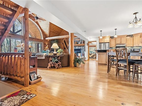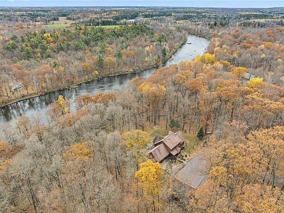 Discover your private sanctuary in this stunning log-sided home, where rustic charm meets luxurious living. Tucked away on a beautifully landscaped 3.4-acre lot with over 240 feet of serene Chippewa River frontage, this property offers a perfect blend of tranquility and high-end features. From the moment you arrive on the blacktop driveway, you'll be captivated by the home's exceptional craftsmanship. Step through the magnificent, custom-carved wooden eagle front door into a breathtaking open-concept living space designed for both grand entertaining and quiet relaxation. The main floor features an inviting open layout, anchored by a gorgeous stone wood-burning fireplace that creates a warm and welcoming atmosphere for family and guests. A chef's dream, the kitchen is equipped with beautiful wood cabinets, elegant Cambria counter tops, and a full suite of premium appliances. It?s perfectly situated for seamless entertaining and everyday meals.Your personal oasis awaits on the main level. The primary en suite boasts a private balcony overlooking the river, a cozy sun room for all-season enjoyment, and a spa-like bathroom featuring a tiled walk-in shower, double sinks, and a spacious walk-in closet. The upper level hosts two comfortable bedrooms and a full bathroom, providing a perfect private space for family or guests. Unmatched Outdoor Living: With over 240 feet of river frontage, your backyard is a gateway to Northwood's adventure. Enjoy fishing, swimming, kayaking, or simply relaxing by the water's edge.Escape to a lifestyle of comfort, luxury, and natural beauty. This riverfront retreat is a rare opportunity to own a piece of paradise.
