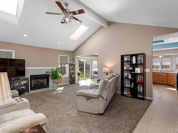 Welcome to this beautifully updated and meticulously cared for 3-bedroom, 2-bathroom ranch-style home in a highly desirable neighborhood in Macomb Township. This spacious, light-filled residence boasts an open-concept layout with vaulted ceilings, skylights, and modern finishes throughout. The expansive great room with a cozy gas fireplace flows seamlessly into the bright kitchen and dining area—ideal for entertaining. The kitchen features ample counter space, stainless steel appliances, and a charming cafe-style accent wall. Enjoy morning coffee or evening meals with a view through the sliding glass doors that lead to your private backyard and patio space. The primary suite offers a peaceful retreat with generous closet space and a private en-suite bath. Two additional bedrooms and a second full bath offer flexibility for family and guests. A dedicated laundry/mudroom with washer, dryer, utility sink, and convenient access to the attached 2-car garage adds ease to your daily routine. Outside, enjoy a well-manicured lawn, low-maintenance landscaping, and a storage shed for extra convenience. Newer mechanicals, vinyl windows, and neutral tones throughout make this home truly move-in ready. Located near schools, parks, shopping, and major roadways—this home delivers comfort, style, and suburban convenience in one perfect package. Schedule your private showing today!
