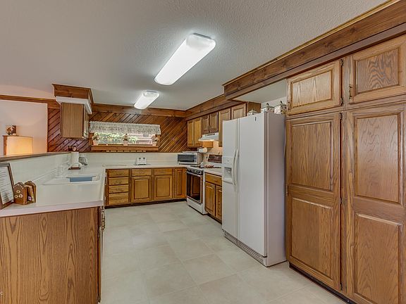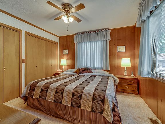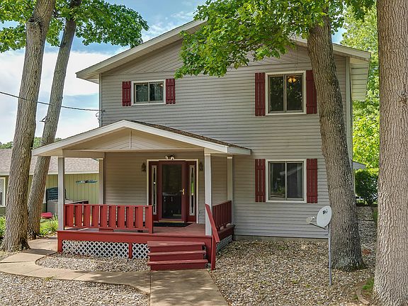 This five-bedroom, two-bath, 2,270-square-foot home on Fishers Lake has a large lakeside deck with benches steps away from the shallow, sandy lake entrance at the private dock. The inside is designed for relaxed lake living. The open-concept kitchen, dining, and living area has deck access, wood accents, and ceiling fans. The street side has a rock-landscaped yard with an inviting front porch. The property includes plenty of off-street parking and a storage shed.
