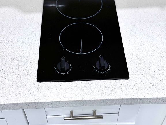 As you walk into the unit, there is a small living space on the right, with a small kitchen to the left. The kitchen is equiped with a tall stainless steel refrigerator, a 2 stove burner, and a multifunctional oven/microwave/air fryer. Kitchen cabinets are modern, with 42" height, allowing for extensive storage space.