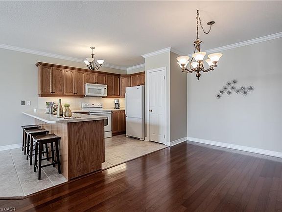 Welcome to Millcroft Place—where thoughtful design meets carefree living in the heart of Uptown Burlington. This sought-after residence is ideal for those looking to downsize without compromise, offering a spacious layout, elegant finishes, and a vibrant community. You’ll enjoy the ease of a low-maintenance lifestyle with shopping, dining, transit, parks, and trails all within walking distance. From the moment you walk in, you’ll appreciate the crown moulding throughout, warm hardwood flooring in the main living areas, and oversized windows that flood the space with natural light. The kitchen is as functional as it is welcoming, with a peninsula breakfast bar, classic tile backsplash, ample cabinetry, and a pantry for all your essentials. Whether you're hosting dinner or enjoying a quiet meal at home, the full-sized dining area offers the flexibility and space to suit your lifestyle. The living room is expansive and inviting, anchored by a cozy gas fireplace that adds warmth and charm to the space. Walk out onto the large, private balcony with sleek glass railing—perfect for relaxing with your morning coffee, tending to a container garden, or watching the sunset in peace. The primary bedroom is a true retreat with a large window, walk-in closet, and private 3-piece ensuite featuring a sleek glass shower. A second bedroom provides space for guests, a home office, or hobbies, while the 4-piece main bathroom offers a quartz-topped vanity and modern finishes. Additional conveniences include in-suite laundry, one underground parking space, and a private storage locker. Enjoy a friendly, well-maintained building with top-tier amenities including an exercise centre, party room, beautifully appointed indoor and outdoor seating areas, and ample visitor parking. All of this just steps from shopping, dining, transit, and Millcroft’s scenic parks and trails. This is downsizing done right—welcome home.