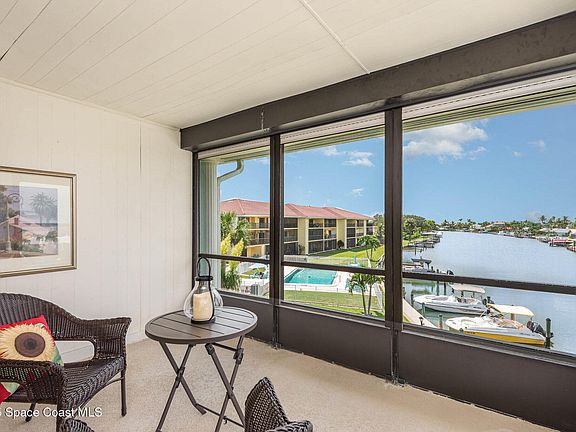 WATERFRONT CONDO in the heart of World Famous Cocoa Beach. Watch dolphins, manatees and mesmerizing sunsets while enjoying your favorite beverage from the privacy of your balcony. This 2-bedroom, 2-bath condo features a spacious primary bedroom with sliders to the balcony and an open floor plan that's convenient for entertaining. Plantation shutters accentuate the space throughout the condo while automatic hurricane shutters keep you safe. Launch your kayak or boat at the boat ramp or relax by the riverside pool. Boat slips are available and the sitting area by the water is a great place to gather with friends and neighbors. Amenities abound for your pleasure. Conveniently located within walking distance to the beach, shopping and restaurants.10-Minutes to Port Canaveral where you can enjoy any of the entertainment venues available, 15-Minutes to PATRICK SPACE FORCE BASE, 15-Minutes to Historic Cocoa Village, 45-Minutes to Orlando Int. Airport and 60-Minutes to Orlando.