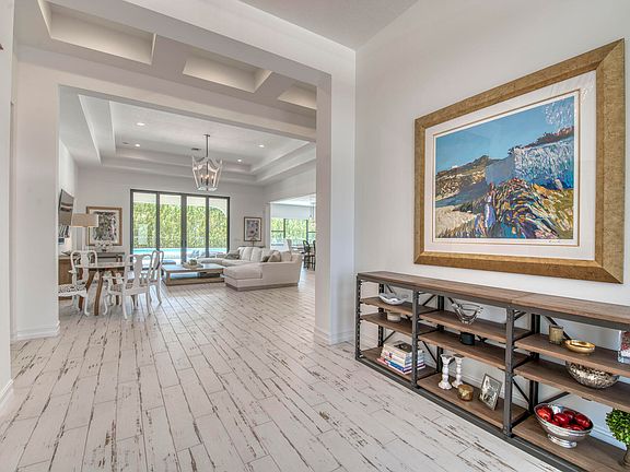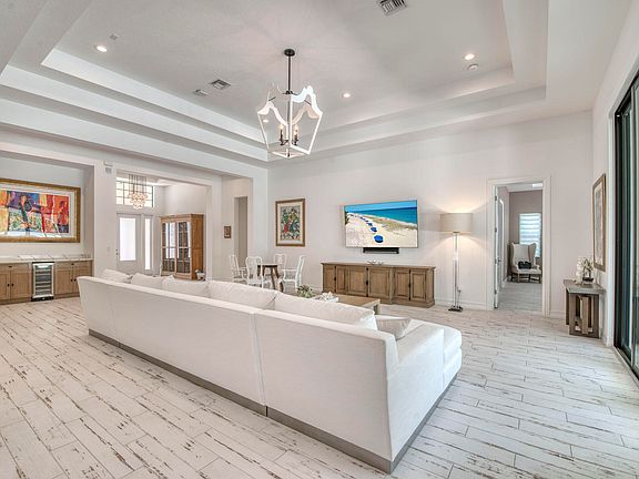 Stunning single-story home in the premier gated community of Prado. This unique home welcomes you with a towering foyer that opens to an expansive great room. The open layout draws your eyes directly to the resort pool and waterfall. The main living areas feature 12-14ft ceilings and dramatic designer lighting. Reclaimed white oak wood look tile throughout home is both beautiful and easy to maintain. The gourmet kitchen features an overside quartz island and walk-in pantry. The primary bedroom is an incredible 20 x 22 with spa bath and private direct access to lanai and pool. The resort pool features a sun shelf, spa and waterfall with defined outdoor living and dining areas. Select furnishings are available and negotiable.