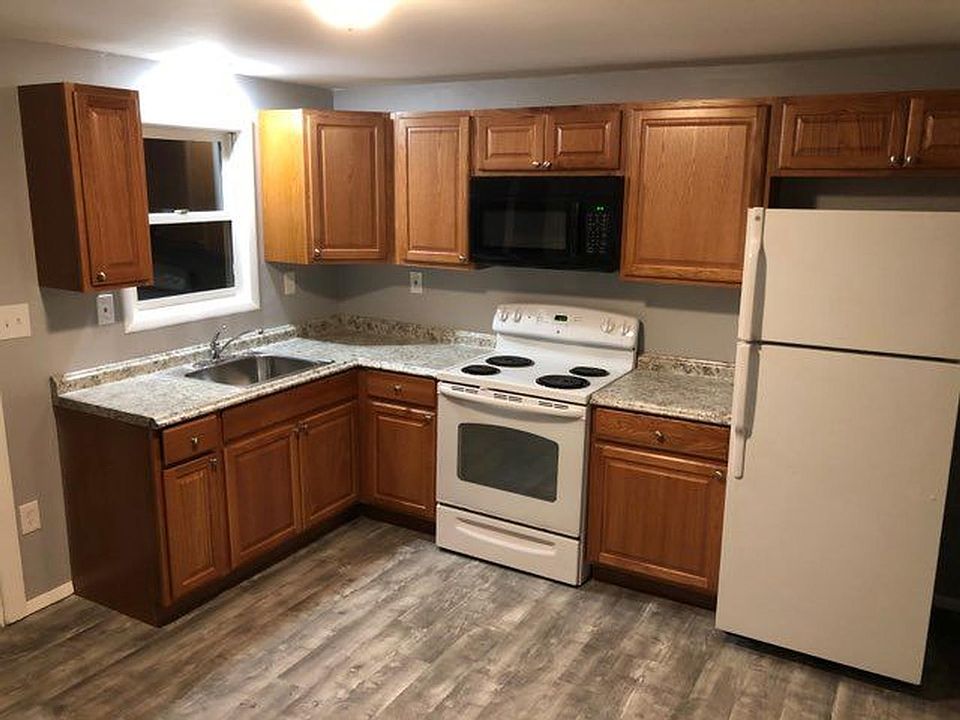 Yearly rental. Duplex apartment with fresh paint and some new flooring. New kitchen cabinets and appliances. First floor laundry room. Off street parking.