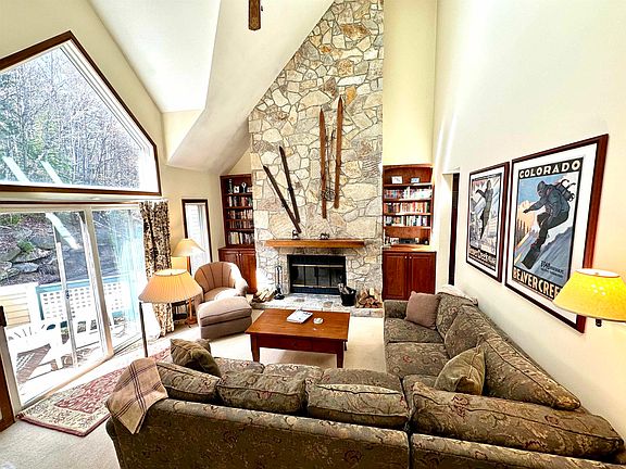 This is the best of all worlds! Ski from your back door or walk down to the newly renovated/expanded Amenities Center with an indoor pool, exercise equipment room, outdoor pool, hot tubs, saunas, lockers and more. This nicely appointed townhome has never been rented and turnkey with furnishings included. There are 3 fireplaces, including one in the primary bedroom with ensuite bathroom. There's a sunny window nook for remote work set-up and high speed fiber internet. The living room with a soaring cathedral ceiling features a gorgeous floor to ceiling fieldstone fireplace, handcrafted built-in Cherry bookshelves and abundant light from the oversized windows. Prepare meals for friends and family in the updated galley kitchen with room for everyone to gather in the spacious dining room. The lower level has two bedrooms, two bathrooms and a bonus room (including a pull-out sofa) offering plenty of space for everyone to spread out and relax in front of the fireplace. The new high speed lift at Sundance has made this complex even more convenient to Mount Snow's expansive trail system!