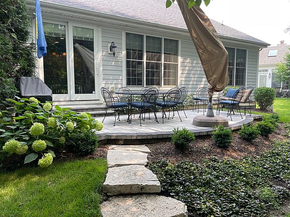 Beautiful ranch home built with superior custom Airhart construction in sought-after Fisher Farm. Gracious and welcoming wide front foyer with upgraded millwork and views straight to the well landscaped backyard. Hardwood floors in hall, dining room, kitchen and living room. Dining room is generously sized and features beautiful millwork and custom roman shades and drapery. Gorgeous kitchen with custom white cream cabinets, granite, under cabinet lighting, center island for additional counter space, pantry, counter bar with seating and breakfast room for additional dining table. Kitchen opens directly to living room as well as Pella sliding door with access to back patio for great entertaining. Step out back and relax on the new gorgeous paver patio (2022) surrounded by beautiful landscaping. The primary bedroom is spacious with west facing windows appointed with custom Hunter Douglas shades. Large primary bath includes walk in shower, large double sink vanity, linen closet and leads to spacious closet with shelving. Two additional bedrooms in front of home offer roomy closets, ceiling fans and custom window treatments. Generous main floor laundry room with white cabinets. Unlimited potential in huge unfinished, insulated basement with 2 egress windows. Extra deep extended 2 car garage provides additional space and storage. Conveniently located near award-winning Wheaton Schools, Western Trail Prairie Path, Klein Creek Golf Course, vibrant downtowns of Wheaton and Winfield, Central DuPage Hospital, restaurants and shopping. Ease of living with exterior lawn maintenance and snow removal included with association membership. Ranch living at its finest.