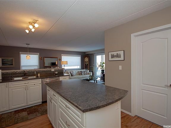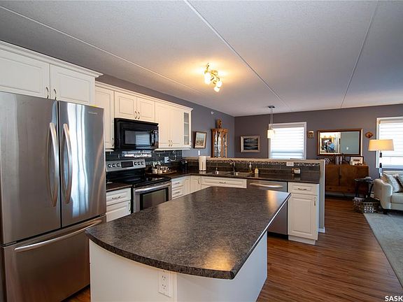You’ll experience comfortable living in this beautiful condo located on the 2nd floor of River Valley Estates in the Town of Battleford. This bright and cheery 1090sqft unit is located on the Northwest corner and has plenty of windows letting in natural light in every room. A spacious entrance way with a large closet welcomes you as you enter. The main living area is open concept and caters to the kitchen with an island, living room with patio doors to the balcony and a dining area with plenty of room for family & friends. A wrap around balcony is a lovely way to spend summer evening as you gaze at the evening sunsets. You’ll appreciate the amazing amount of storage with 2 storage units at each end of the balcony. The large master bedroom is complete with an generous amount of closet space, a linen closet, and a 3pc en-suite for added privacy. The 2nd bedroom functions as a guest room or office space and there is also a 4pc main bathroom. The separate en-suite laundry with some storage is a convenient addition. All the appliances and window coverings will remain. The building has an elevator which makes it easy for anyone to have access. There is also an amenities room and exercise room to use. You’ll love the heated indoor parking spot so you’ll never have to brave the winter elements again! There’s visitors parking as well. If you’re ready for the carefree condo life call today to book your showing!