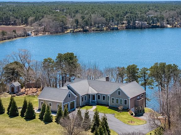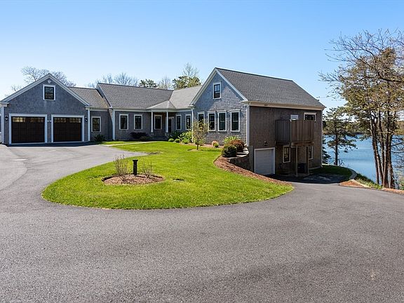 Overlooking Hinckley Pond, this luxurious home offers elegance and comfort. The landscaped yard welcomes you, providing ample parking and space for a boat/oversized vehicle. Once inside you are greeted by breathtaking views of the pond through expansive windows and lofty ceilings. Open-concept living room, kitchen, and dining area create an inviting space for gatherings, while the screened porch beckons for summer evenings. Enjoy the convenience of a walk-in pantry and a separate laundry room. The primary suite has picturesque views, private outdoor shower and bathroom. The main floor also features two guest bedrooms, one which is currently used as an exercise room. In the lower level, high ceilings frame a family room and guest room. Luxury finishes abound, including three garage bays, on-demand water heater, and a generator. Cozy up by the gas fireplace, or venture outdoors to the patio or descend to your private dock. An exceptional opportunity for those seeking a waterfront haven.