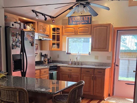 Wood burning stoveStainless appliancesSpray foam insulationPropane stoveHardwood floorsCathedral ceilingsKitchen with breakfast bar