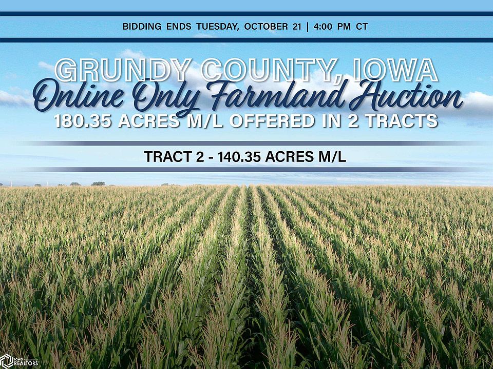 Grundy County, Iowa Online Only Farmland Auction - Bidding is Currently LIVE and will end October 21st at 4PM! Tract 2 presents as 140.35 gross acres m/l located in Section 20 of Felix Township in Grundy County, Iowa. The tract contains 125.84 FSA cropland acres, of which 93.44 m/l acres are currently in row crop production with a CSR2 average of 86.4. The balance of the 32.40 FSA cropland acres are currently enrolled in CRP programs CP21 (Filter Strips) & CP42 (Pollinator Habitat), producing an annual total payment of $9,317. CRP Contracts 2.51 acres enrolled in CP21 (Filter Strips) | Contract expires 9/30/30 | $382.05 Rental Rate per Acre | Annual Payment of $959 18.54 acres enrolled in CP42 (Pollinator Habitat) | Contract expires 9/30/26 | $314.76 Rental Rate per Acre | Annual Payment of $5,836 11.35 acres enrolled in CP21 (Filter Strips) | Contract expires 9/30/35 | $222.09 Rental Rate per Acre | Annual Payment of $2,522 The majority of the tillable acres in Tract 2 are classified as HEL (Highly Erodible Land) with primary tillable soil types of Tama silty clay loam, Colo silty clay loam, and Muscatine silty clay loam. This tract has access from the north via paved County Highway D65 and from the south from 320th Street, allowing for excellent grain marketing opportunities. Multiple established creek crossings are in place to access the tillable acres, with the exception of the 8.52-acre tillable field. Visit our website for more information!