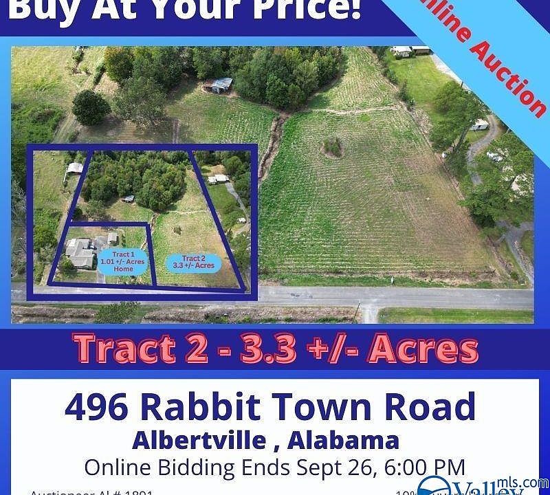 Tract 2 –Beautiful 3.34-Acres in a Peaceful Rural Setting Near Albertville! Discover the possibilities with this 3.34-acre tract of land, perfect for those seeking space and privacy. Located in a rural neighborhood, this property is fenced, making it ideal for agriculture, livestock, or building your dream home. With plenty of open space and easy access to Albertville, this land offers a prime opportunity for development or personal use. Whether you're looking for room to expand or seeking a quiet retreat away from the hustle and bustle, this property provides endless potential in a picturesque country setting. Bid and buy at your price!