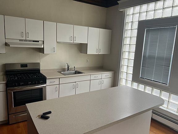 Spacious and beautiful 1 bedroom one bath apartment in a renovated mansion. Tall beamed ceiling fireplace and an open concept kitchen living space with island makes this a very impressive property. Off street parking . Great commuter locations.. Tree lined neighborhood 1 year lease . Lease includes electricity. Tenant will pay a fee for a window a/c for 4 months if needed ($ 70.00 per month ) . Tenant pays gas for cooking . Must have excellent credit , background and stable employment.