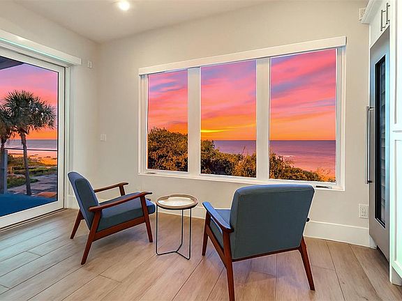 Direct beachfront luxury home in Indian Rocks Beach. Experience modern coastal living in this exceptional single-family home in sought-after Indian Rocks Beach. Built in 2022, this contemporary masterpiece combines striking design, quality construction, and breathtaking views, offering an unparalleled Florida lifestyle. This spacious four-bedroom, 5.5-bath residence boasts over 5,500 total square feet, 3,870 square feet under air, with solid block construction and storm-rated tinted windows and doors for energy efficiency and turtle protection. A three-car tandem garage accommodates up to six vehicles. Go outside to your private paradise with a beachfront heated swimming pool and hot tub, expansive lounge deck with sun chairs, picnic tables and barbecue grill, and a private path with direct access to the sugar-sand beach. Inside, a custom double-door entry with etched glass tropical artwork welcomes you into a grand foyer with elevator access to all four levels. The main living level offers a coastal-elegant ambiance with floor-to-ceiling windows framing epic water, beach, sunrise and sunset views. Driftwood-inspired plank tile flooring flows throughout. The gourmet chef’s kitchen is a dream with a large island with seating, premium Thermador stainless steel appliances, built-in double ovens, cooktop range and hood, full-size wine refrigerator, custom wood cabinetry, white with gray veined quartz countertops, intricate tile backsplash and designer pendant lighting. Both the kitchen and living area open to a spacious balcony overlooking the pool and beach. This level also features a guest bedroom with en suite, powder room, and laundry/mechanical room. The third level hosts the luxurious beachfront primary suite with a sprawling balcony, spa-inspired bath with a free-standing soaking tub, custom tile shower with glass enclosure, and a walk-in closet with custom built-ins. Two additional bedrooms with en suites, each with designer baths, share a hallway featuring a stylish wet bar with sink, mini-refrigerator and stone countertops. The top floor offers a unique loft-style studio complete with a kitchenette, queen-size pullout sofa, full bath, and two sliding doors leading to a rooftop terrace with 360-degree panoramic views of the Gulf and beyond. Ideal as a primary residence, vacation retreat or high-income investment property, this home has no minimum rental restrictions and comes fully furnished with elegant coastal décor, turnkey and ready to enjoy. In walking distance to charming shops, boutiques, restaurants and pubs, with convenient access to Clearwater Beach, major bridges and two international airports, enjoy world-class fishing, snorkeling, paddle boarding, boating, or simply unwind on the beach with a cold drink as the sun sets over the Gulf.