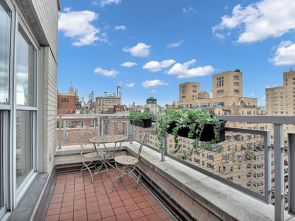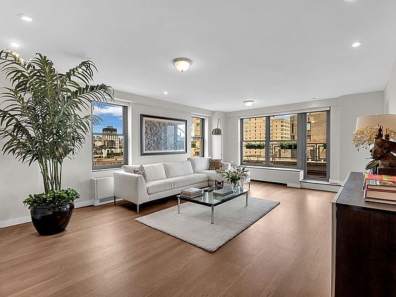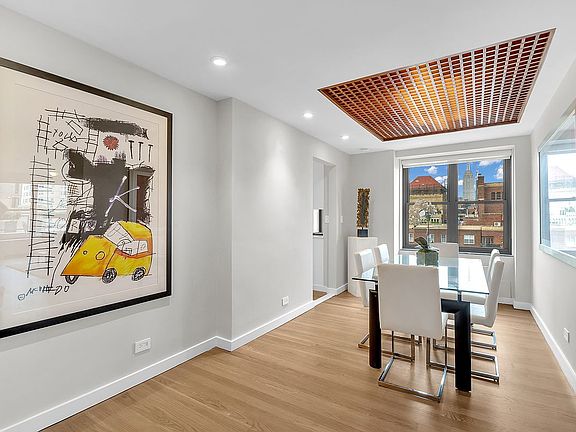 Through the entry foyer, the dining area with views of Hudson Yards and the Empire State Building makes a statement and ideal for entertaining guests. The adjacent windowed kitchen has been tastefully renovated with integrated appliances including a dishwasher and ample storage. The corner living room continues to impress with stunning views and access to the private terrace overlooking Fifth Avenue. The living room is well proportioned and provides a comfortable place to relax.