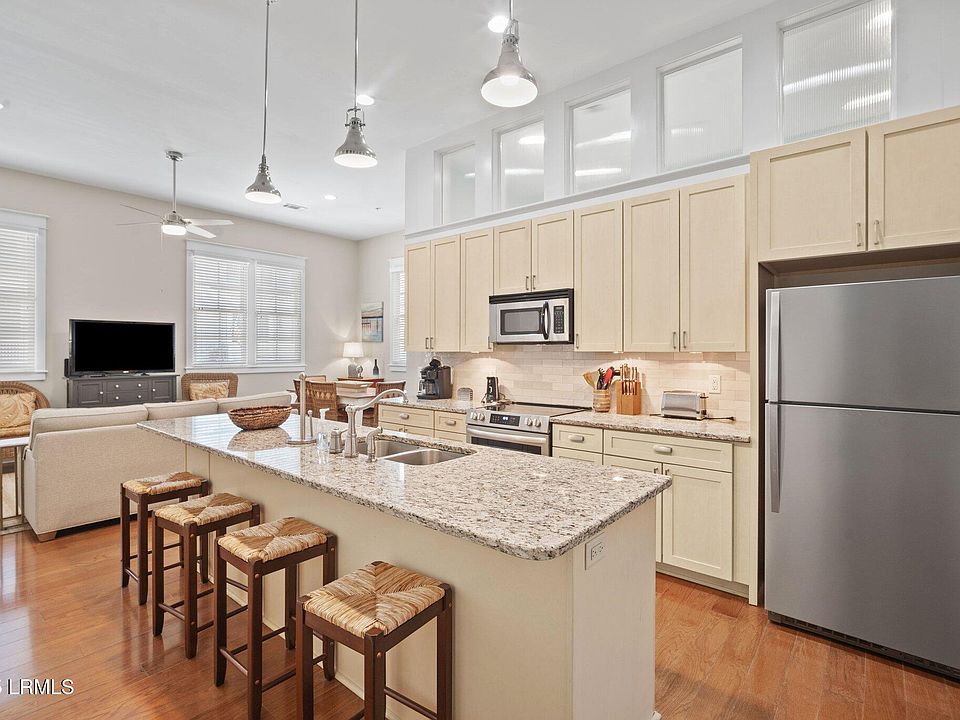 Private patioFirst levelStainless steel appliancesHigh ceilingsHardwood floorsIn-unit laundrySpacious primary suite