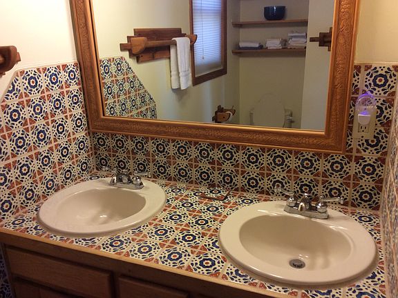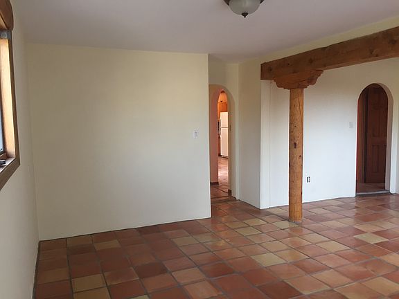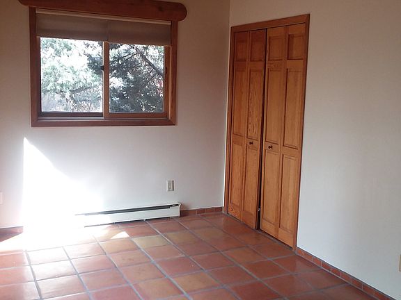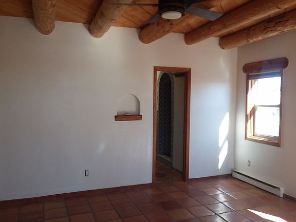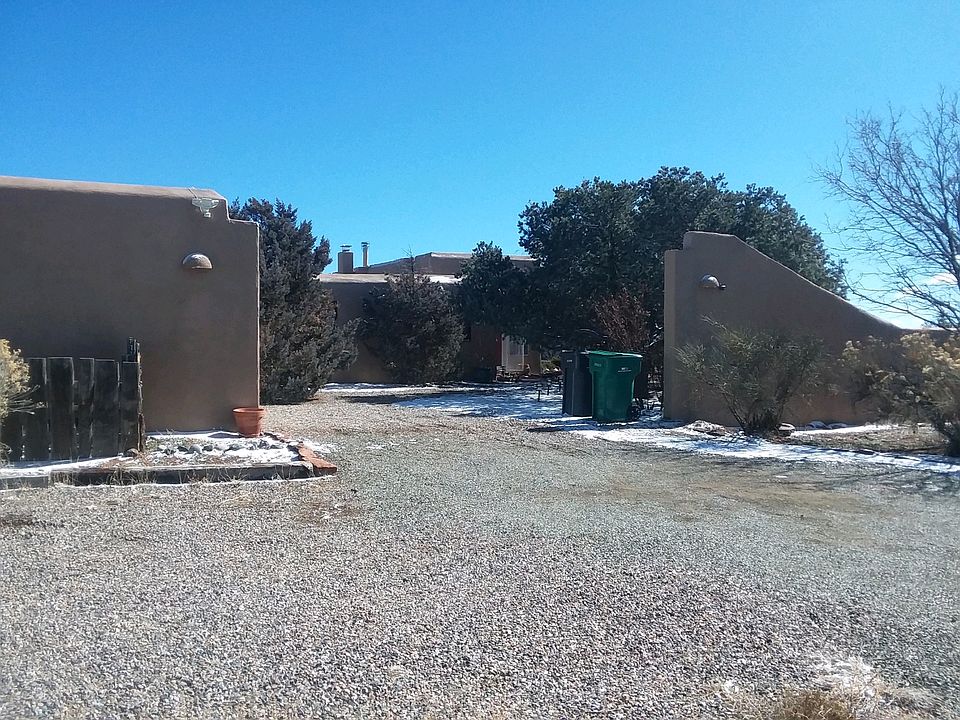 Open floor plan passive solar house in Eldorado with Saltillo tile floors throughout. Talavera tile in kitchen and baths. Ceilings feature large vigas and beam construction. Great room has high ceilings with expansive windows to take in views of the Sandia and Ortiz mountains. Custom Hunter Douglas solar shades in great room are see through while providing UV protection. Kiva, gas, and wood fireplaces. Mini Split HVAC system to be installed first week in March. Large outdoor enclosed and landscaped patio area. Master bedroom located off living room with walk-in closet and separate access to enclosed patio. Other bedrooms/office on opposite side of house. 2-car garage. Easy access to Santa Fe Rail Trail and extensive greenbelts. Tenant responsible for utilities