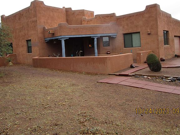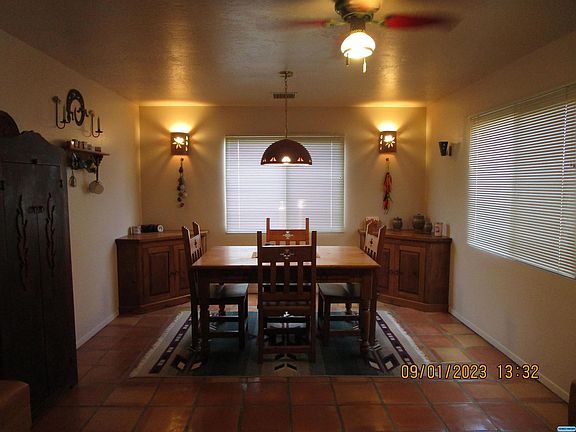 This Pueblo style two bedroom two bath home is located on a quiet lane in the Burro Mountains on 5 acres of horse property. The home is perfect for entertaining; the kitchen/dining area flow into the family room and onto the covered brick patio. The entry has lighted nichos to display your treasures; the formal living room is framed by beautiful spiral wood pillars. The primary suite is large with walk-in closet and bath with double sinks, walk-in shower and soaking tub. The 2 car garage is oversized; all cabinets will stay. The small barn has water and 220 and a covered area for an RV. Included is a large metal shed on concrete pad; the propane tank is buried. The home faces west and southwest for comfort in winter and summer.