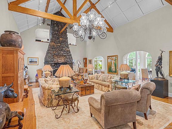 Experience the pinnacle of luxury living in this magnificent 7-bedroom, 6.5-bath expanded ranch, perfectly situated on a sprawling 0.76-acre lot in the prestigious Village of Great Neck Estates. Designed for both comfort and grand entertaining, this home features an open-concept layout with soaring vaulted ceilings, hardwood flooring, and multiple stone fireplaces. The sun-drenched living room flows seamlessly into the elegant formal dining room, while the expansive eat-in kitchen completes with high-end appliances, a charming breakfast nook, and an adjacent den serves as the heart of the home. A spectacular sunroom spans the width of the house, offering stunning views of the resort-like backyard with its patio, built-in BBQ station.