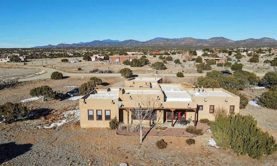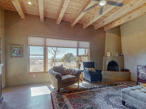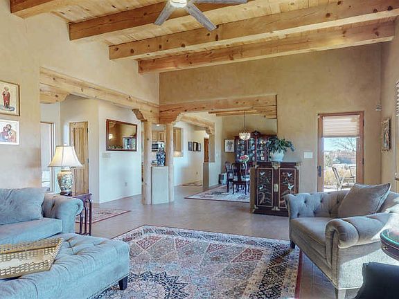 A truly special Eldorado home, located on a quiet corner lot with beautiful views of the Sandia/Ortiz mountains. Built in 2007, this well maintained home is set on 1.34 acres overlooking an expansive, dedicated greenbelt. Features include a 2300 sqft, split bedroom floor plan; master bedroom and office/4th bedroom with private entrance on one side and 2 additional bedrooms on the other side; high beamed ceilings and plaster walls in the living and dining areas, wood burning kiva fireplace, radiant heat, whole house mini splits air conditioning, beautiful brick floors throughout; stainless steel appliances; a generous kitchen with attached den. Outside a wonderful covered rear portal to take in the sunsets and a welcoming, landscaped, front entry courtyard with covered patio for star gazing, plus a high fenced side yard perfect for pets. As part of the Eldorado Community you'll enjoy miles of improved trails, a community center/club house with pool and athletic facilities, a dog park, restaurants, shopping, senior center, library, and a fantastic community school.