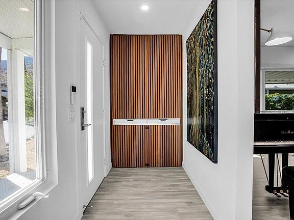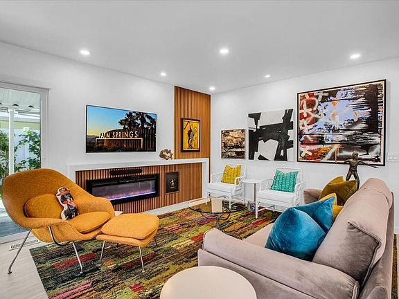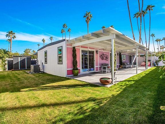 MUST SEE!! No land tax !!Totally renovated and ready to show off! This very large 2 bed/2 bath is like brand new inside and out. No expense was spared! Enjoy new windows, doors, floors, a new foam roof with 5 year warranty, new solar attic vents with electric back up, freshly landscaped yard, and a new storage shed. Each room opens up to gorgeous mountain views and private ground level outdoor living space. Inside, unexpected luxury will dazzle you! Your guests will be stunned by the modern glass electric fireplace and gorgeous custom walnut features in the living room and entry foyer. All new cabinetry and quartz countertops make the home feel light and fresh and you'll LOVE the custom tile backsplash in the kitchen. Entire home has all new Samsung appliances, mechanical systems, custom roller shade screens and high-end light fixtures throughout, European ceiling fans in the bedrooms. The large primary bedroom welcomes tons of light, custom built-in closet system, and en-suite bath featuring a Smart toilet/bidet and dual shower head. Enjoy no the 2 doggie parks on site, Palm Canyon Mobile Club is nestled amongst 350 Palm Trees, it has a year round heated pool and jacuzzi, State of the Art fitness center and is right up against our beautiful Palm Springs mountains.Fantastic south Palm Springs neighborhood surrounded by multi-million dollar homes of The Mesa, Indian Canyons,Close to Ace, Koffi and Smoketree or a short distance from town