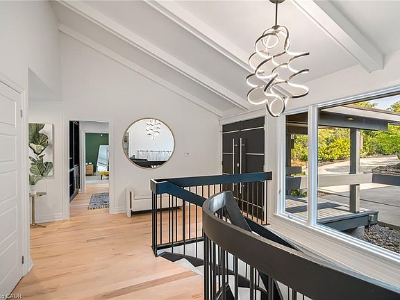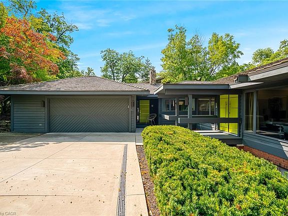 Tucked at the back of a quiet cul-de-sac, in a highly coveted south St. Catharines neighbourhood that's set at the base of the Niagara escarpment. This residence offers both comfort and seclusion. Nearly half an acre surrounded by mature trees for privacy and designed for resort-style living. A sweeping driveway leads to a sprawling bungalow with ground-level walkout across the back of the home. Inside, vaulted ceilings welcome you into the foyer with its matte finish natural hardwood floors that continue past the powder room and into the stunning kitchen. Here you'll love the 10 foot quartz waterfall island, abundant cabinetry and an appliance package that includes twin fridges, Miele six-burner gas range, Bosch built-in dishwasher and wall oven, Sharp convection/steamer and microwave drawer, plus a 50+ bottle wine cooler. A coffee bar station completes the space. The kitchen flows into the vaulted family room with a sleek linear fireplace and direct access to a raised deck overlooking the backyard oasis with its 18x36 heated saltwater pool, gardens, patios, and lounging areas. The dining room, positioned between the family and living rooms, shares these views, while more oversized windows in the living room frame the treed setting below. The bright office is a perfect quiet space to work from home or could also be converted to a main floor laundry room. It leads right into the primary suite that enjoys its own private raised deck, extensive floor-to-ceiling closet cabinetry, and a 4 piece ensuite with huge shower and heated floors for a spa-like touch. A spiraling staircase leads to the lower level with 3 additional bedrooms, two full baths, and a large rec room. A walk-in sauna pairs perfectly with the poolside walkout and its incredible backyard. Every season is unforgettable here: coffee on the deck, summers by the pool, autumn colours, and cozy winter evenings. This is truly a one-of-a-kind home where every single day - you'll love where you live!