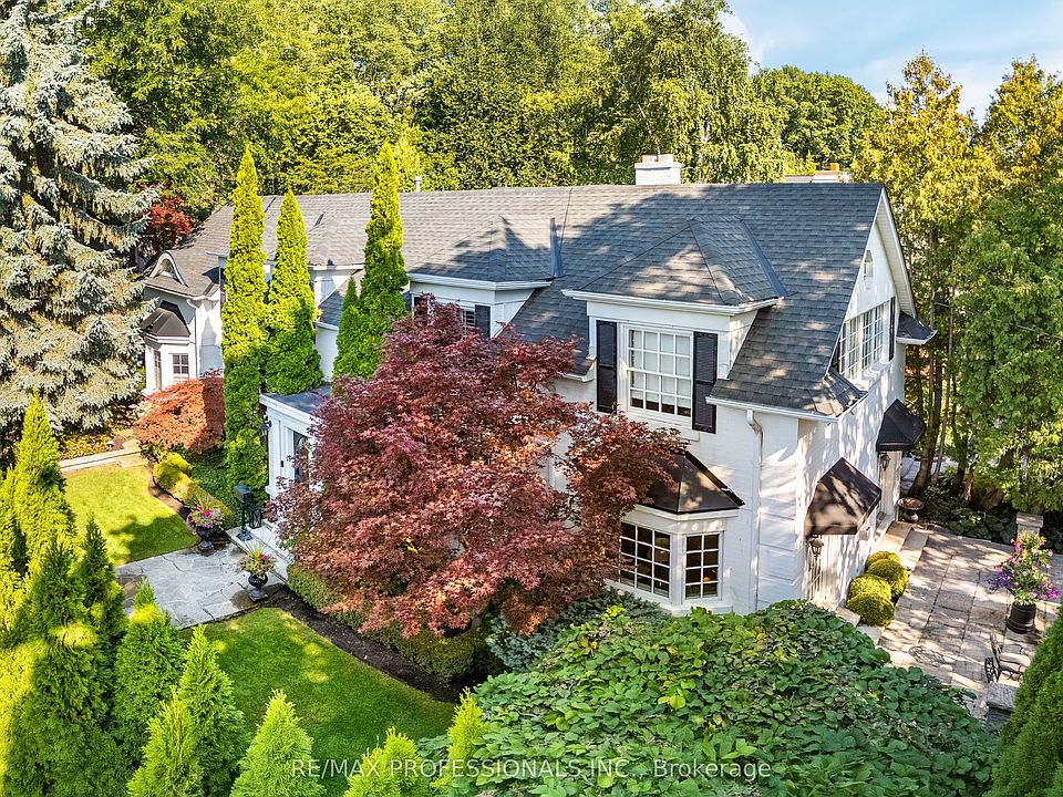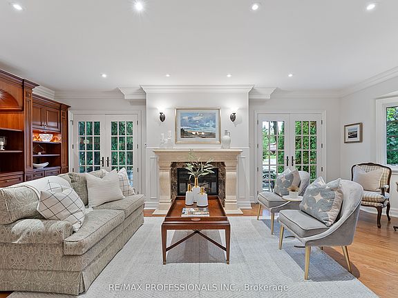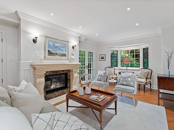 Welcome to 2 Canterbury Road, a refined 4-bedroom brick residence offering 3,370 sf of beautifully finished living space in prestigious Humber Valley Village. With classic architecture, elegant interiors and meticulous craftsmanship, this home exudes sophistication and enduring quality. The main level features a grand living room with limestone fireplace, bay window and walkouts to a stone patio, formal dining room with gas fireplace, crown moulding, hardwood floors and custom built-ins, massive chef's kitchen with granite counters, centre island and stainless-steel appliances, a bright breakfast area framed by arched French doors, an adjoining family room with a gas fireplace, custom millwork & multiple walkouts, convenient laundry room with Miele appliances and built-ins and a refined powder room. The 2nd level hosts a graceful primary suite with wall-to-wall built-ins, two walk-in closets, a built-in desk & a spa-like 5-piece ensuite with marble finishes, double vanity, soaker tub & glass shower, 3 additional bedrooms with hardwood floors including one with a vaulted ceiling and walk-in closet and another with ladder access to a finished attic & an updated 3-piece main bath. The finished lower level offers a rec room with pot lights, gas fireplace and an office nook with a built-in desk & bookcases, a wine cellar with tasting island & slate flooring, a wet bar, a 3-piece bath and ample storage. Impressive exterior grounds framed by stately trees, manicured gardens and sculpted hedges reminiscent of a traditional English garden, a row of mature cedars providing year round privacy, multiple stone patios, two yards, irrigation and accent lighting. Double car garage and private drive- parking for 4 cars. Exceptional location steps to KCS and Humbertown Shopping. Near Humber River trails, Lambton Woods, golf clubs, Kingsmill Plaza, top schools- HVJMS, OLS & ECI and easy access to Royal York Subway. A sophisticated, meticulously maintained home in prime Humber Valley!