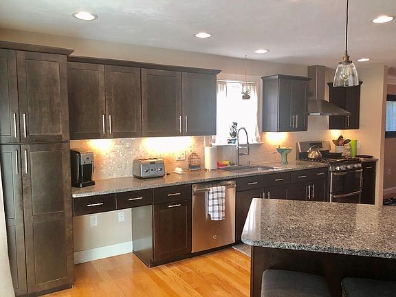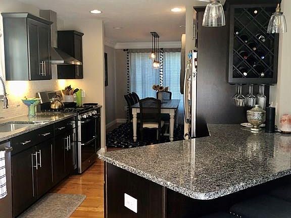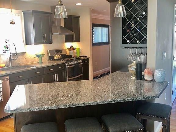 - Kit Dscrp: Flooring - Hardwood, Countertops - Stone/Granite/Solid, Pantry, Breakfast Bar / Nook, Recessed Lighting, Stainless Steel Appliances, Cabinets - Upgraded, Kitchen Island, Exterior Access, Deck - Exterior, Slider, Gas Stove, Peninsula, Lighting - Pendant, Lighting - Overhead