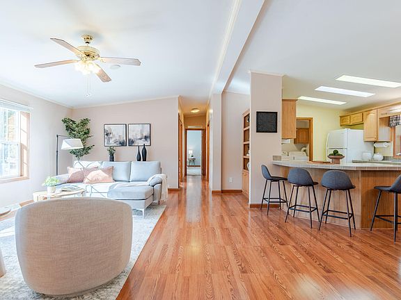 This spacious three-bedroom, two-bath double-wide home is located in Keywood Manor, Southern Maine's premier 55+ community, offering the perfect blend of comfort and convenience. The open-concept living area features a bright and inviting living room with built-in bookshelves and plenty of space for a dining table. The primary bedroom suite includes a private bath with double sinks, a jetted soaking tub and separate shower, creating a peaceful retreat at the end of the day. The second and third bedrooms are ideal for guests, a home office, hobbies, or crafting, offering flexibility to suit your lifestyle. Enjoy your morning coffee or visit with friends on the expansive farmer's porch, perfect for relaxing outdoors. Additional features include a laundry room and a detached one-car garage for added storage and parking convenience.