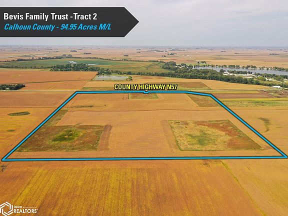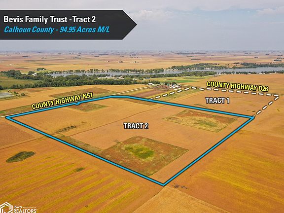 Calhoun County, Iowa Farmland Auction - Mark your calendars for Wednesday, November 19th, 2025, at 10:00 AM! Pleased to represent the Bevis Family Trust in the sale of their family farm located north of Rockwell City, Iowa, and just east of Twin Lakes, Iowa. The portfolio consists of 152.80 acres that will be offered as two individual tracts via public auction utilizing the "Buyers Choice" auction method. Tract 2 consists of 94.95 acres m/l (to be surveyed) with an estimated 94.57 FSA cropland acres and a CSR2 soil rating of 86.6. Prominent soil types include Clarion loam, Webster clay loam, and Canisteo clay loam. Of the cropland acres, there are approximately 27.70 acres enrolled in the Conservation Reserve Program (CRP). These acres carry an average CSR2 soil rating of 84.6 and would be conducive to farming. The balance of the tract consists of 66.87 cropland acres currently in a corn and soybean rotation. These acres have a CSR2 soil rating of 87.5. For the 2025 growing season, the west half of the farm was planted to corn and the east half was planted to soybeans. Farming rights are available for the 2026 growing season. The notch in the western boundary of the tract is owned by the neighbor to the north and that property's well is located on that parcel. An additional 0.06 acres were included in the original CRP acres for this tract, but will not be included once the acres are reconstituted with a new buyer. Drainage tile is on the farm.