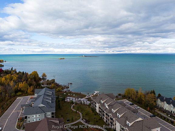 Welcome to Wyldewood Cove, where breathtaking Georgian Bay views and four-season living come together in perfect harmony. This beautifully designed 1-bedroom + den, 2 full bathroom condo offers an exceptional lifestyle in one of Collingwood's waterfront communities. Step inside to a bright, open-concept layout featuring a walkout to the terrace, modern finishes, and a cozy gas fireplace perfect for winter evenings. The kitchen is ideal for entertaining, with stainless steel appliances, a granite breakfast bar that seats four, and ample storage. The primary bedroom includes a 4-piece ensuite, while the den functions perfectly as a home office or second bedroom, with a 3-piece bath conveniently located just across the hall. Your private covered terrace overlooks the year-round heated outdoor pool, with the serene backdrop of Georgian Bay just beyond. From here, it's only steps to the waterfront patio and pergola the perfect place to unwind and watch Collingwood's spectacular sunsets. In the warmer months, enjoy swimming, kayaking, and paddleboarding from the community dock.Additional features include a private storage locker for bikes, skis, or golf clubs, access to a fitness centre, and beautifully maintained grounds with scenic trails close by. Ideally situated between downtown Collingwood and Blue Mountain, you're just minutes from golf courses, ski hills, shops, restaurants, and more.