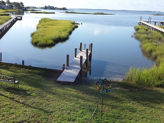 Beautiful waterfront home boasting three bedrooms and three full bathrooms (two master suites!). Vaulted ceilings are found throughout this spacious, single story home. The floor plan of the main spaces is open: from the large entrance area/great room there is unobstructed line of sight to the rear deck, accessible through sliding doors off of the kitchen and adjoining family room, and the master bedroom. The deck itself spans the width of the rear of the home, with a central screened-in sitting area leading to the stairs. The views of this quiet end of the bay are spectacular! The backyard gently slopes down to the bay, where a small private dock will give you access to the water (perfect for kayakers!). Sea turtles can sometimes be found in the yard! There are new stainless steel appliances and granite countertops in the large, eat-in kitchen. This small community also benefits from low taxes and HOA fees. All reasonable offers considered! 3% realtor co-op