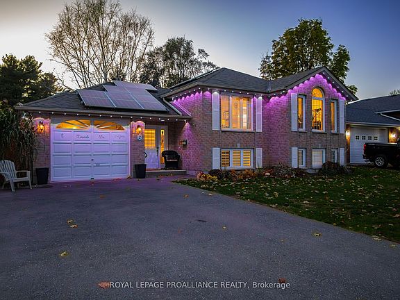 Arguably one of the best streets in Brighton. Beautiful collection of homes on quiet cul-de-sac, moments to downtown & amenities. Short walk to: grocery, schools, rec centre, Proctor Park & downtown core. Gorgeous oversize lot is one of the highlights of this special home. Fully fenced, pie-shaped lot measures 133ft deep with a spectacular backyard oasis offering various sitting & entertaining areas. Out the back door is the first deck with gazebo area & outdoor lighting. Towards the middle of yard is a bar area on deck with metal roof, featuring a BBQ area, bar fridge & quartz counter. Towards the back corner is a lovely raised seating area with pergola, perfect for entertaining & taking in gorgeous sunsets. Rounding out the features is a newer garden shed & firepit area. Private lot with mature birch & pine trees & 8ft fencing on each side between neighbours. Enter this Colorado-style bungalow through a large foyer with both garage & backyard access. Up a few stairs is the main living area boasting over 1300sqft as well as 2 bdrms. Gorgeous open concept living & dining areas with newer laminate flooring, large front facing windows & semi-vault ceiling in the dining rm. Eat-in kitchen has been updated with new cabinet doors, new counters, tile backsplash (2024), as well as newer stainless steel appliances & reverse osmosis. Also on main lvl is a laundry rm with sink plus 2 bdrms incl. primary with cheater access to 4pc. bath. Fully finished lower lvl maximizes the space offering an additional 2 bdrms (for a total of 4), 2nd bath (3pc.), spacious rec rm, storage rm, utility rm & a bar/lounge area for watching sports or gatherings with friends. Layout & proximity to plumbing make this space ideal for a 2nd kitchen, offering in-law suite potential. Other features in 2024 incl: gas furnace, heat pump/air con, hot water on demand & water softener. Outside provides paved parking for 6 cars, attached single garage & roof-mounted solar array providing additional income.