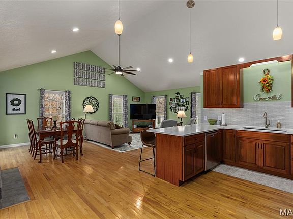 Comfort Meets Wooded Serenity Near Lake Lou Yaeger! Discover peace, privacy, and beautiful wooded views in this stunning home located in the desirable Day Spring subdivision - just moments from Lake Lou Yaeger. Thoughtfully designed and impeccably maintained, this spacious 4 bedroom, 3 bath home offers comfortable main level living with abundant space below. The main level features two bedrooms and a full bath, primary bedroom with en suite, and an updated, stylish kitchen with stainless steel appliances and quartz countertops, backsplash and sink that were replaced in 2024 that’s ready for entertaining. The bright living room and dining area welcomes you with natural light and a wood-burning insert perfect for cozy evenings at home. The walkout lower level is mostly finished and adds valuable living space, including a large recreation or family room, an additional bedroom, a full bath, and generous storage areas. Whether you need room to spread out or space for guests, this level offers tremendous flexibility. A major perk for storage lovers: the attached garage provides easy access to the attic for even more usable space. Outside, you’ll appreciate not only the natural surroundings but also the heated and cooled detached garage that's ideal for hobbies, a workshop, or extra parking. This property blends custom craftsmanship with modern updates and scenic views, all in a peaceful location near outdoor recreation and lake life.