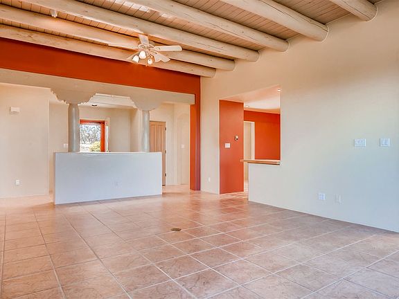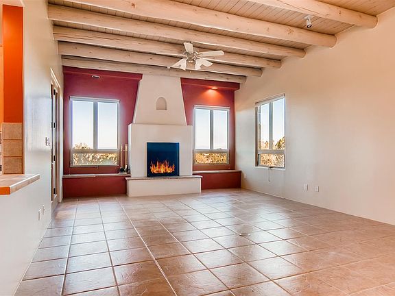 Majestic Jemez views from the dramatic great room with extra high via ceilings and beautiful fireplace. This home has office space as well as a studio space with a separate entrance. Master has a private walled patio and generous shower. Quiet cul-de-sac location. Studio has a heat/ac split system. In-floor natural gas radiant heat. Generous pantry space. ALL PLUMBING IS PEX. New hot water heater. Recent roof upgrade with 2-year warranty. New paint and deep cleaned. NO STEPS. Ready go go!