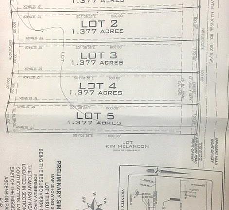 VACANT LAND - 1.377 Acres. Great location - take LA HWY 44 to Bayou Narcisse, cross over Roddy Rd and the property is located about 1 mile down on the right!! Cleared lot with several mature trees. Plenty of room for a large home and large shop- lot measures 100'x600' - Land is surveyed with markers. Possible 100% land financing(WAC)!! Call for more info.