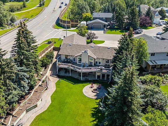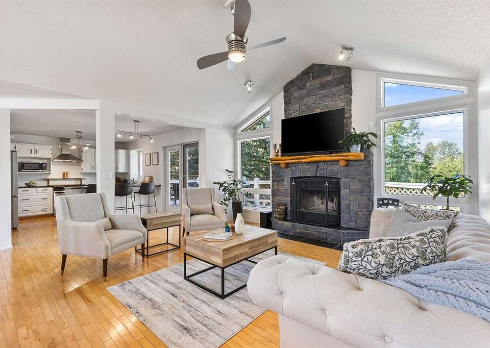 Truly one-of-a-kind, this exceptional walkout bungalow is more than a home—it’s a feeling, a lifestyle, and a rare opportunity in the heart of Cochrane. Perfectly set on an expansive lot, it captures the best of both worlds: the serenity of the river pathway system and Bow River just steps from your backyard, and the energy of historic downtown with its shops, cafés, and restaurants only minutes away. From the moment you arrive, this home welcomes you with undeniable character. An 800-square-foot triple garage and an elegant stamped concrete driveway set the tone, while inside, soaring vaulted ceilings and a dramatic stone wood-burning fireplace create a sense of warmth and grandeur. Freshly painted throughout, the interiors feel light, renewed, and ready for their next chapter. The updated kitchen blends timeless style and function with crisp white cabinetry, modern hardware, and newer stainless steel appliances, while the cheerful breakfast nook opens onto a west-facing deck bathed in afternoon sun. Surrounded by mature trees with no rear neighbors, this outdoor space is private, peaceful, and seamlessly connected to pathways leading to parks, disc golf, and the river valley. Every corner of the main floor tells a story of comfort and intention. Sunlight pours into the dining room through picture windows, while the versatile office provides the perfect space to work or host. The primary retreat feels like its own sanctuary, offering dual closets, private deck access, and a spa-inspired ensuite with a soaking tub, tiled shower, and dual vanities—perfect for unwinding at the end of the day. Downstairs, the walkout level is designed for connection. The spacious family room invites you to gather around a brick-faced wood-burning fireplace, a natural centerpiece for laughter, late-night conversations, and cozy winter evenings. Just beyond, the cedar-lined sunroom is pure magic—a space that carries the calming scent of cedar and blurs the line between indoors and out. Whether imagined as a hot tub or sauna retreat, a reading nook, a gardener’s haven, or a creative studio, it’s a space that invites you to pause, breathe, and escape. Three additional bedrooms, a full bathroom, and a laundry room complete this level, making it as functional as it is inviting. Step outside and you’ll discover a lot that feels almost limitless. It’s a canvas for your outdoor dreams—whether entertaining, gardening, or simply enjoying time with family. With space to park an RV, an oversized garage with 220-volt wiring, and in-floor heating on the lower level, practicality is woven seamlessly into the property’s charm. Additional highlights include new windows in the living room and garage, new vinyl plank flooring in the lower bedrooms, a 5-zone sprinkler system, security system, and LED lighting in both the sunroom and garage.. With its unmatched location, timeless character, and endless possibilities, this home is more than a place to live—it’s a place to belong.