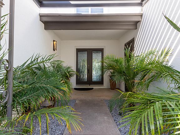 Welcome to this stunning residence on a peaceful cul-de-sac in sought after Moon Valley! You'll be delighted by the inviting living room with a neutral palette, tile flooring, a cozy fireplace, and sliding doors that lead to the fabulous backyard for seamless indoor-outdoor living. The eat-in kitchen comes with quartz counters, wood shaker cabinetry, recessed lighting, and stainless steel appliances. The main bedroom includes classic plantation shutters, an ensuite with double sinks, and a walk-in closet. Venture out into the enchanting backyard, boasting covered patio's w/misters, travertine pavers, an outdoor fireplace, lush natural turf, and a spectacular heated pool! Please see property features list in docs! Age restricted community, no permanent residents under 40.