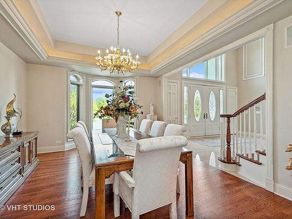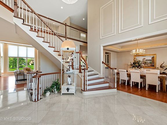 Welcome to 2 Eastings Way, a breathtaking, luxurious, custom-built home in the prestigious South Barrington Community. Prepare to be wowed by this stunning, spacious, and meticulously maintained home with spectacular pond views. As you step through the front door, you'll be greeted by a grand foyer with soaring ceilings, an elegant motorized chandelier, marble floors, and a dramatic staircase. The main level boasts hardwood floors throughout a spacious living room, formal dining room, and home office, which also features custom build bookcases and filing cabinets. The beautiful hardwood floors flow through the gourmet kitchen complementing the timeless white Italian custom-made cabinetry and a large center island. The main floor also includes a luxurious primary suite with a sitting area, and spa-like bathroom with whirlpool tub and glass-enclosed shower. There are 3 additional bedrooms upstairs; two share a jack-n-jill bath, and the other is an en suite. The finished walk-out lower level offers plenty of room for entertaining, with a full kitchen, wet bar, and recreational room. There is also an additional exercise room and bathroom. Outside, the professionally landscaped grounds offer privacy and tranquility, with a large deck overlooking the serene stocked fishing pond. Other features of this exceptional home include 10" ceilings on the main level, 9' ceilings on other levels. a 3.5-car oversized garage, central vacuum, and a security system. Located in a prime location, this home is just minutes away from world-class Barrington schools, shopping, dining, and entertainment options. Don't miss your chance to own this exceptional estate in one of the most desirable neighborhoods in the Chicagoland area. Check out the virtual tour under additional information.