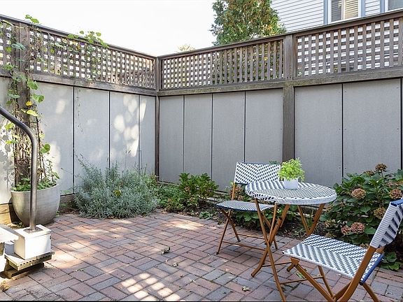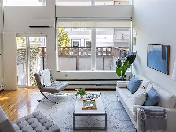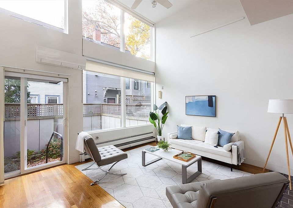 2 Ellery Square is a delightful sunlit single-family in the heart of Mid-Cambridge, with over 1900 square feet of contemporary-style living space. Each of its four bedrooms has its own level; two have en-suite full bathrooms. The design embraces nature in the city: oversized windows let morning and afternoon light stream in, the two-story living room overlooks a private patio, and the main bedroom connects to a sunny top-floor deck. Inside, clean lines and an open plan give a sense of spaciousness, with hardwood floors in the main rooms and new carpeting on the stairs. Either or both of the two middle bedrooms could make an excellent office, study, or media room, while the downstairs bedroom suite would be ideal for a guest or nanny. The property is perfectly located, not far from Harvard, Central, and Inman Squares and across Broadway from the award-winning Cambridge Public Library. Attached garage parking, a well-run homeowners' association, and high walk/bike scores make this a find