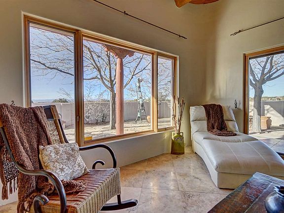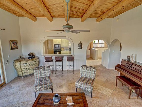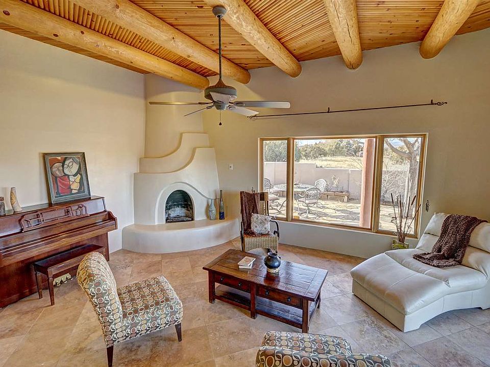 Bright light filled Estambre Pueblo Style home. Gorgeous Eldorado Mountain views. Built by Homes by Marie, National Home Builder of the Year 2012. 3 Bedroom/ 2 Full Bath, Double car attached garage. High knotted pine vigas ceilings in living area. Two kiva fireplaces. Fine Nichos finish. Bright great room floor plan. Formal dining plus breakfast area.Travatine floors throughout home. Split-bedroom floorplan. Low maintenance landscaping. Inviting and lovely wrap around patio garden area access from kitchen and living room increasing livable space. And much much more. Call for more information and to schedule your private showing today.